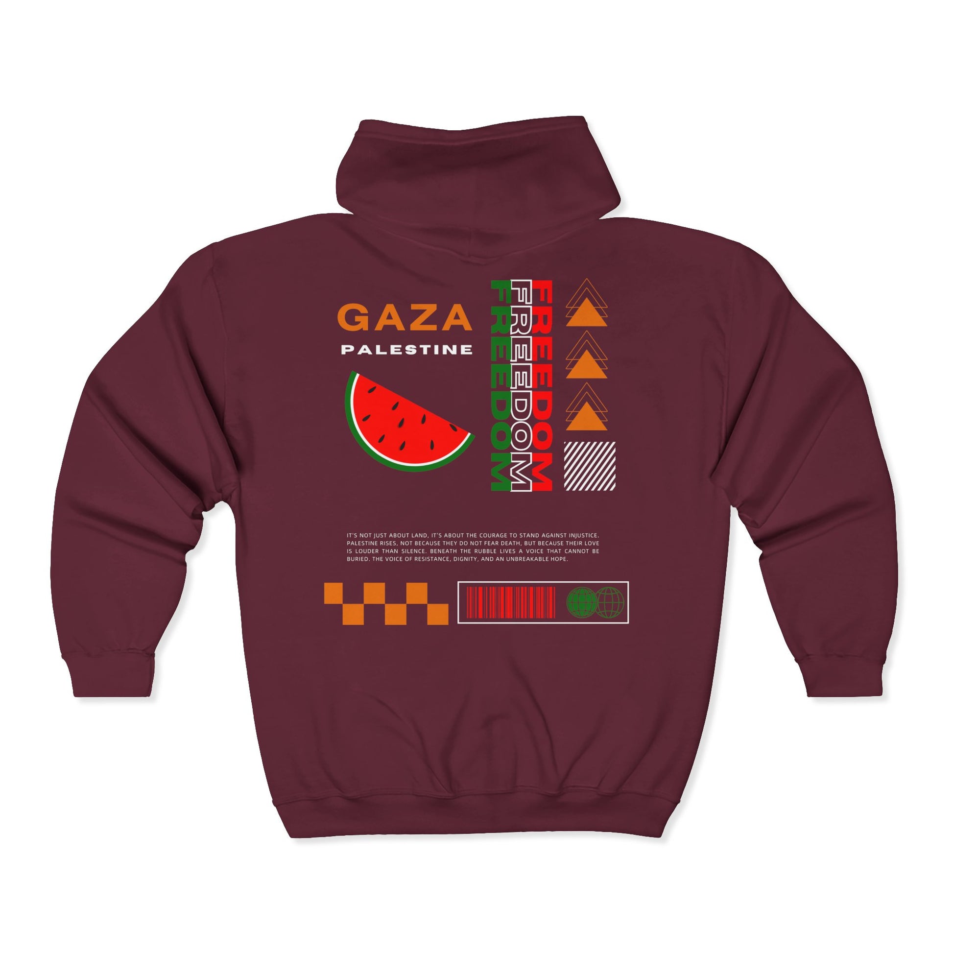 Stay warm while making a bold statement with our Full Zip Hoodie From the River to the Sea, Palestine Will Be Free. Designed for comfort and impact, this hoodie features powerful pro-Palestine messaging alongside symbolic elements like the keffiyeh pattern, watermelon emblem, and olive branch of peace.